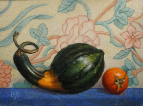 I liked the contrast of autumn and summer in this painting. The summer flowers are in the background, as autumn has arrived with it's harvests of vegetables.